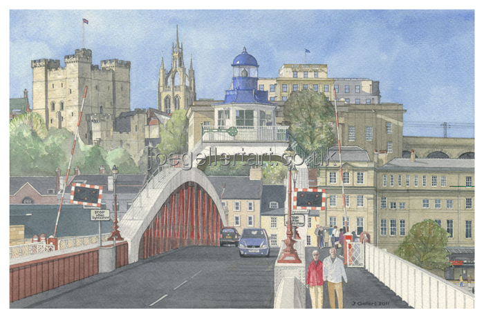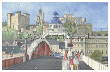 Newcastle Quayside viewed from the Gateshead side of the Swing Bridge, with the Norman Castle and St. Nicholas Cathedral on the skyline.